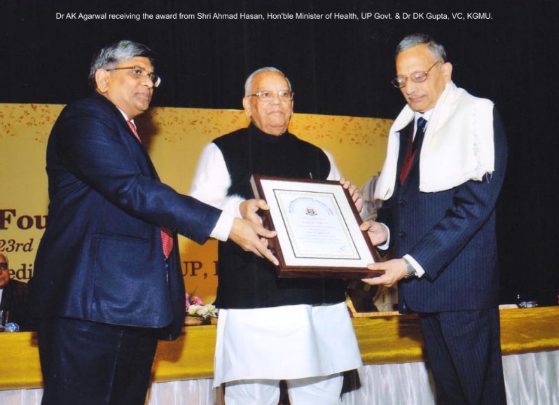 Dr AK Agarwal, Lucknow. Foundation Day Award of KGMU, Lucknow, 2013, awarded to Dr AK Agarwal by the Hon'ble Minister of Health UP Govt. and the Vice Chancellor, KGMU.