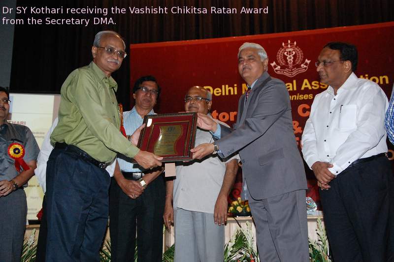 Dr SY Kothari, New Delhi. Vashisht Chikitsa Ratan Award, Awarded by the Delhi Medical Association.